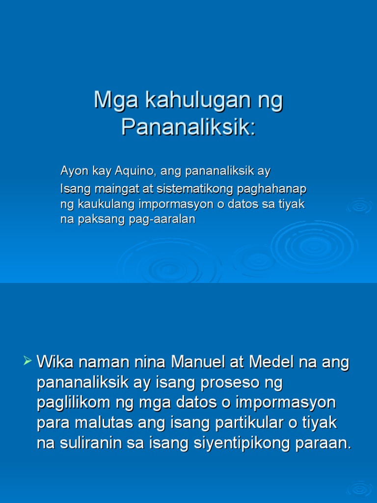 Kahulugan Ayon sa Ibat Ibang Mga Awtor. Ipinapahiwatig niya na dinadala ng mga mambabasa ang kanilang kaligirang kaalaman karanasan at emosyon sa kanilang binasa. Binigyang-kahulugan nina Nuncio et al2013ang pananaliksik bilang isang lohikal na proseso ng paghahanap ng sagot sa mga tanong ng mananalikisik na nakabatay sa problema at metado ng pag-aaral tungo sa produksiyon ng maraming kaalaman at kasanayan upang makatugon sa pangangailangan ng tao at lipunan.