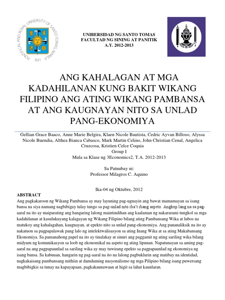 Ang Kahalagan At Mga Kadahilanan Kung Bakit Wikang Filipino Ang Wikang Pambansa At Ang Kaugnayan Nito Sa Unlad Pang Ekonomiya Pdf