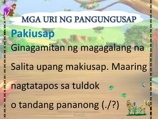 9 NA URI NG PANGUNGUSAP NA WALANG PAKSA Eksistensyal Padamdam Pakiusap Temporal Modal Mga Ka-pandiwa Penomenal Mga Panawag Pambating Panlipunan 3. Tandang Pananong ginagamit upang magtanong. Mga uri ng pangungusap 1.