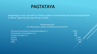 Ibigay ang pagkakaiba ng sumusunod. Kompyutin ang Pambansang kita ng bansa sa pamamagitan ng ibat-ibang pamamaraan batay sa mga haypotetikal na datos. C gastusin ng sambahayan o personal consumption expenditure.