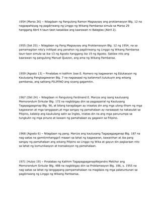 Mga anyo ng wika. Ang Ilokano ay may pinakbet samantalang ang Bikol ay may laing. Ito ay mga Kautusang TagapagpaganapKautusang Pangkawaran Memorandom Proklimasyon at iba pa na nagpapahayag tungkol sa wikang pambansa.