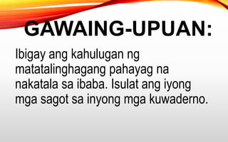 SKYFAKES Eros Atalia Alas dose na. Ibigay ang kahulugan ng mga sumusunod na mga salita. Nasasagot ng maayos at tama ang mga pokus na tanong sa pagbabalik-aral.