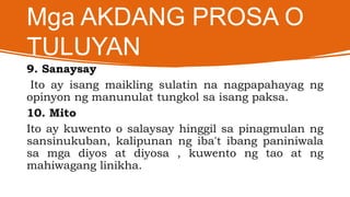 Kahulugan Layunin At Mga Salik Na Nakakaapekto Anyo Uri Kahalagahan At Mga Halimbawa Ng Akda Sa Bawat Anyo Panitikan ang tawag natin sa lahat ng uri ng pahayag--nakasulat man ito binibigkas o kahit ipinahihiwatig lang ng aksyon ngunit may takdang anyo o pormakatulad ng tula maikling kwento dula nobela at sanaysay. Bukod sa kayarian ang pang-uri ay mayroon ding antas o kaantasan. Ang tuluyan o prosa na sa salitang Ingles ay prose.