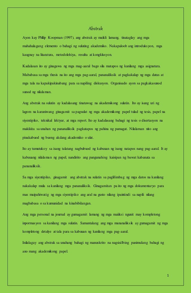 Rationale ang bahaging ito ay naglalaman ng kasaysayan o dahilan kung bakit napili ng manunulat anlg isang paksa. Ang abstrak ay ang ang paglalagom na madalas ginagamit sa thesis scientific papers technological lecture mga report at iba pa tulad ng artikulo ulat pag-aaral at pananaliksik. Ang sulinarin at Kaligiran nito.