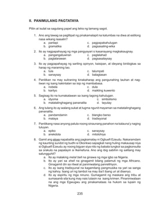 Ilagay sa sagutang papel. Ang mga mag-aaral ay magbibihis na gaya ng mga bayani mga pinuno ng bayan o kahit sinong kilalang tao na maaari naman na kaugnay sa paksang tinatalakay. Sinisipa sinasampal siņasakal o sinasaktan ang mga anak o mga alagang hayop.